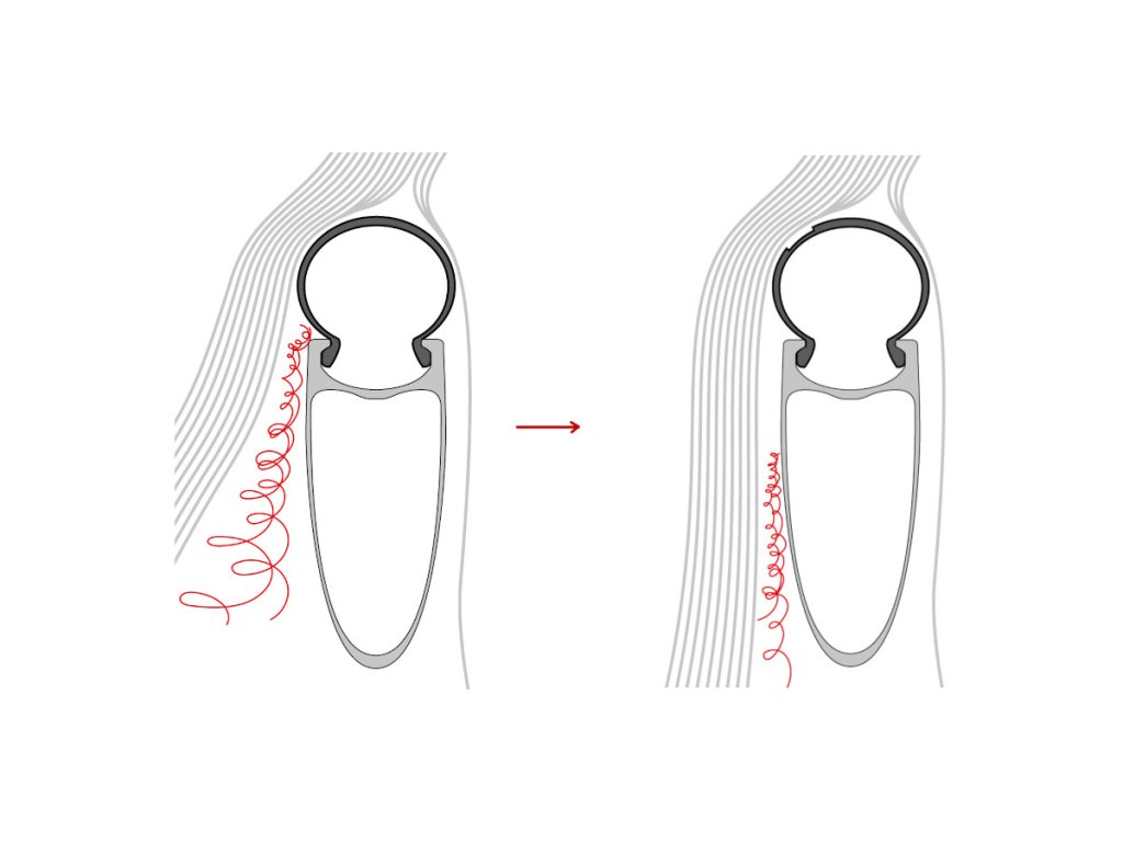 I při nižších profilech ráfků má jezdec z tohoto efektu prospěch, protože laminární proudění vzduchu zůstává déle přiléhající k ráfku. Tím se snižuje aerodynamický odpor systému kolo-plášť při všech rychlostech.